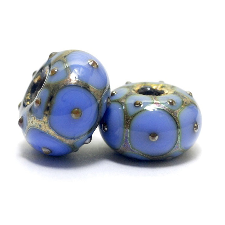 Handmade rondelle beads in soft periwinkle, accented with shimmering metal dots for a unique and elegant finish.
