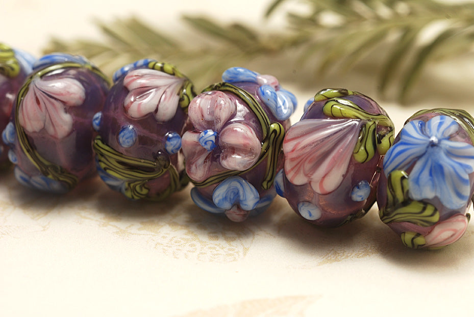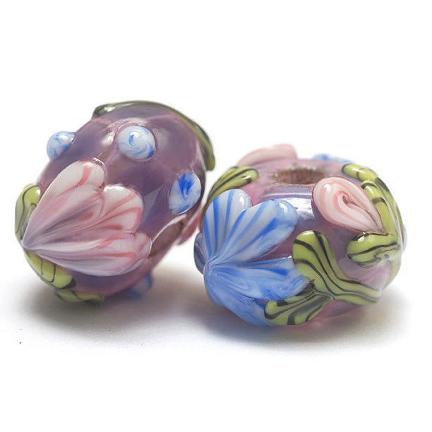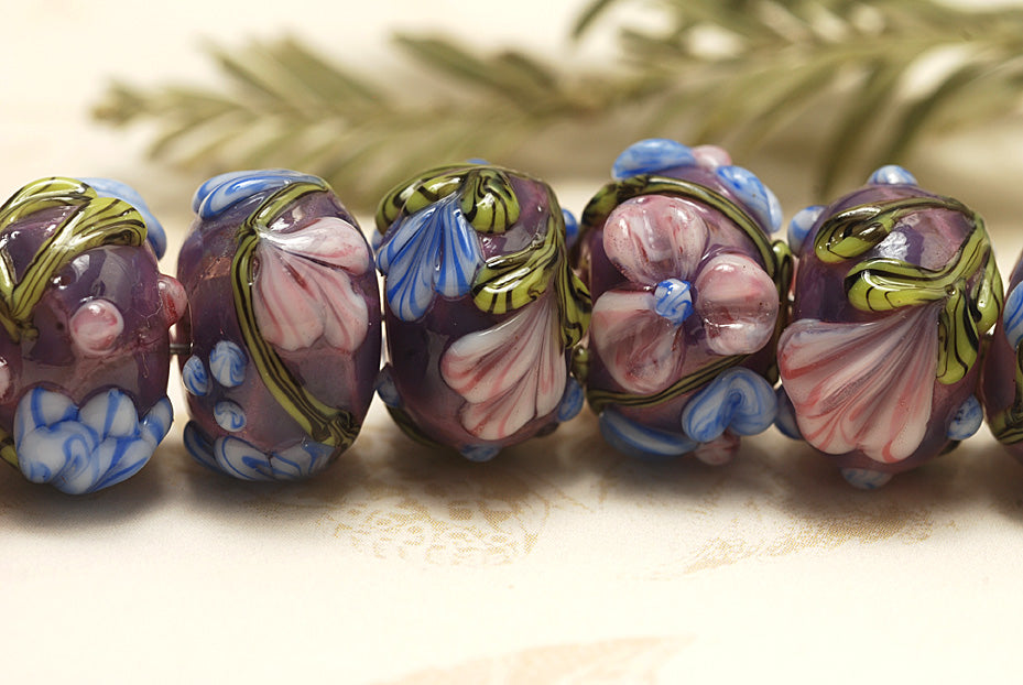 Handmade Rondelle beads in the Violet Garden design, ideal for creating elegant and colorful jewelry pieces.