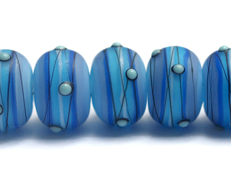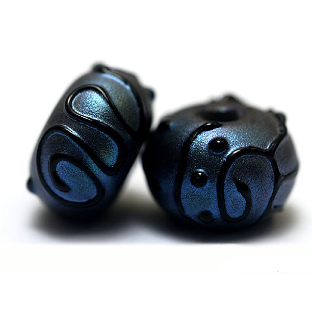 Handmade Rondelle beads with a high-metal-gloss blue surface and raised black stringer. Same design on both sides.