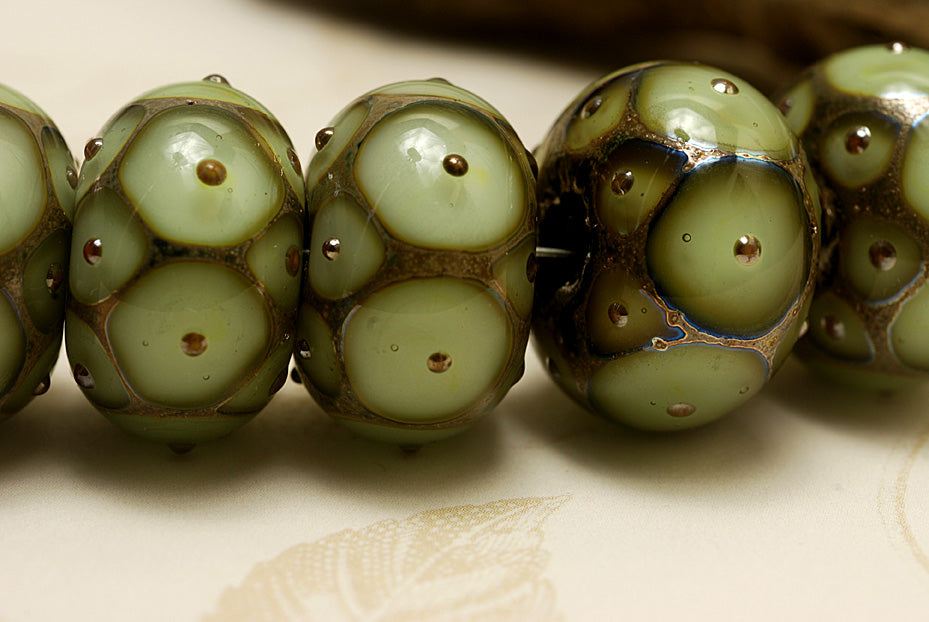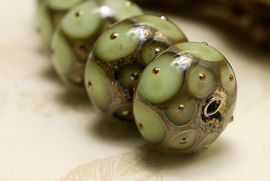 Venetian & Murano Glass Beads Handmade in California10504921 - Six Moss Green w/Metal Dots Rondelle BeadsRaised dots design.Size: 16x10mm