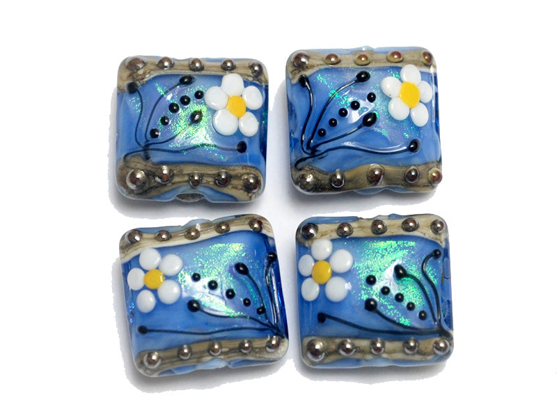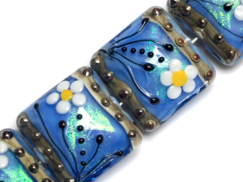 These handmade lampwork pillow-shaped beads feature a delicate Arctic blue floral design on both sides, perfect for adding a touch of elegance to your jewelry creations.