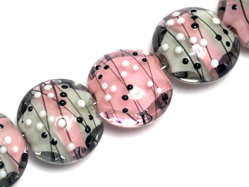 Little black and white dots on pink and gray shiny glass bead. Same design on both sides.
