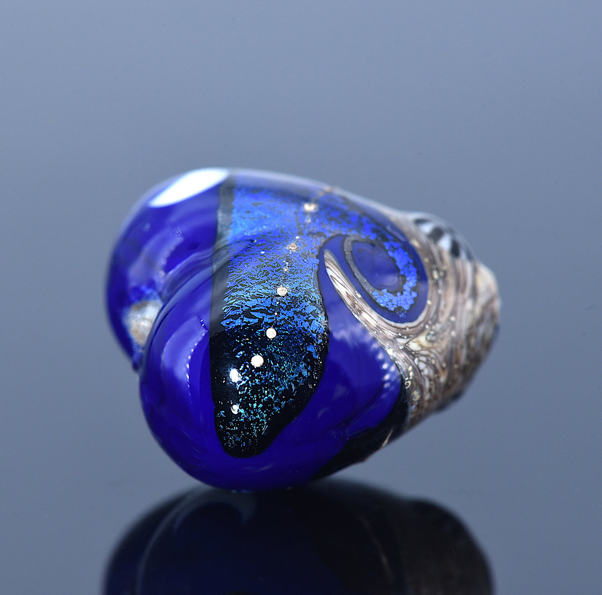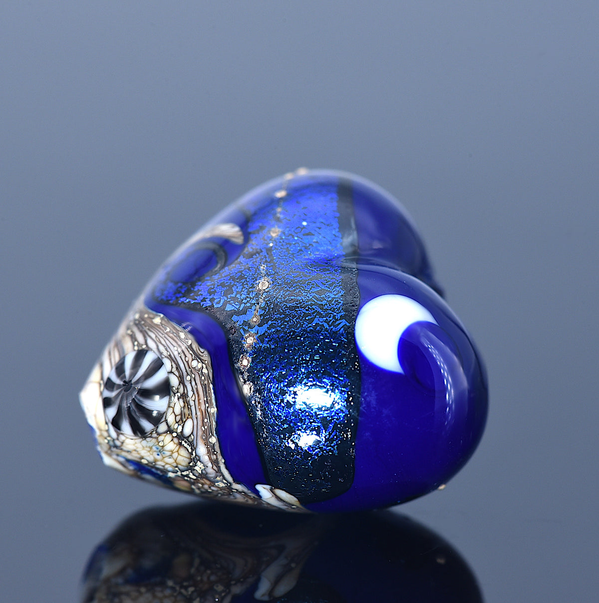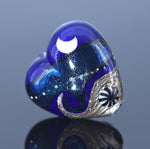 Add a celestial touch to your jewelry with this handmade Cobalt Celestial Heart. Featuring a freestyle design of waves and moon on a cobalt blue base with blue dichroic, the intricate pattern appears on both sides. The front and back surfaces are slightly rounded, giving the heart a dimensional, artisanal look.