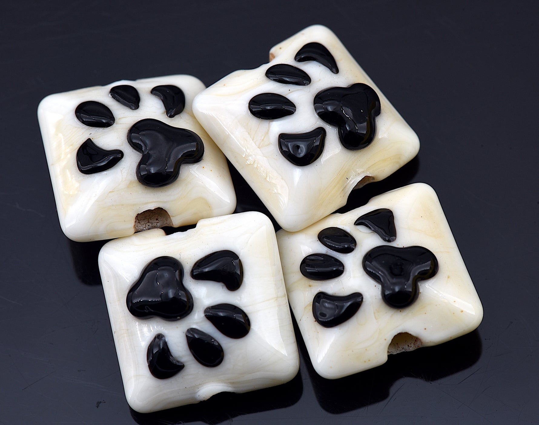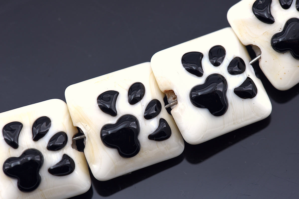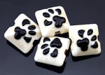 Black paw prints on an ivory glass bead. The ivory glass naturally develops random yellowish fine lines—this is a unique, one-of-a-kind effect, not a defect.