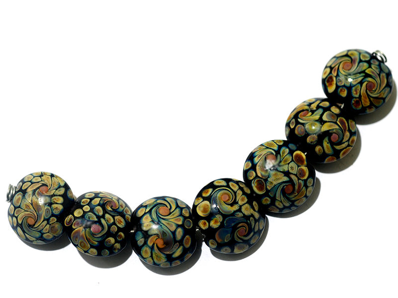 11200802 - Seven Black w/Twisted Beige Dots Lentil Beads