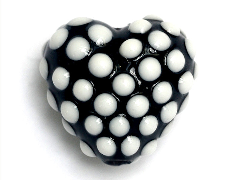 This handmade glass heart bead features a bold black base with white polka dots. Both front and back surfaces are slightly rounded, and the design is the same on each side.