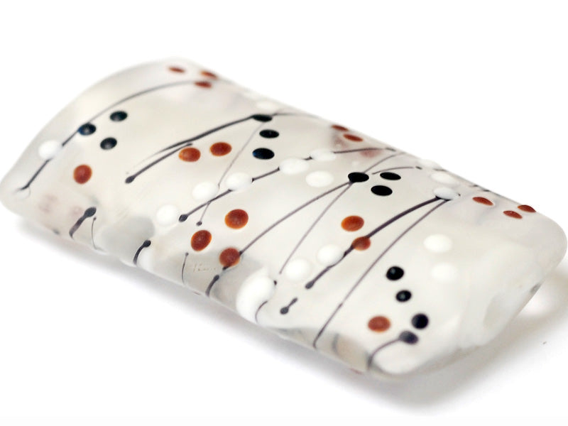 Little red, white and black dots on a frosted glass bead. Same design on both sides.