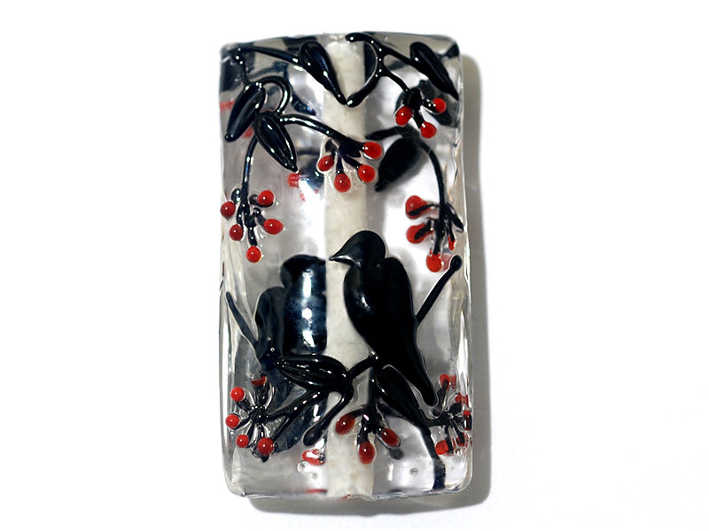 Little red, white and black dots on a frosted glass bead. Same design on both sides.