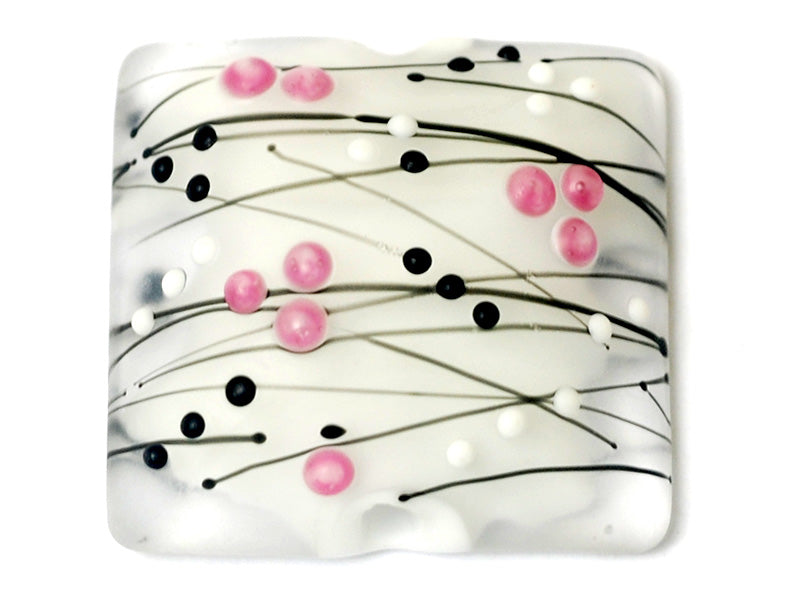 Little pink, white and black dots on a frosted glass bead. Same design on both sides.
