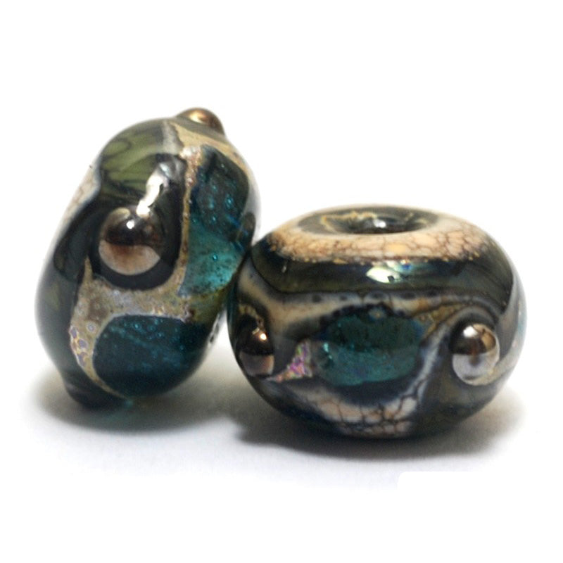 These beads include sterling silver foil fused inside, creating a unique metallic finish. They are layered with different shades of transparent ocean blue for a rich, dimensional look.