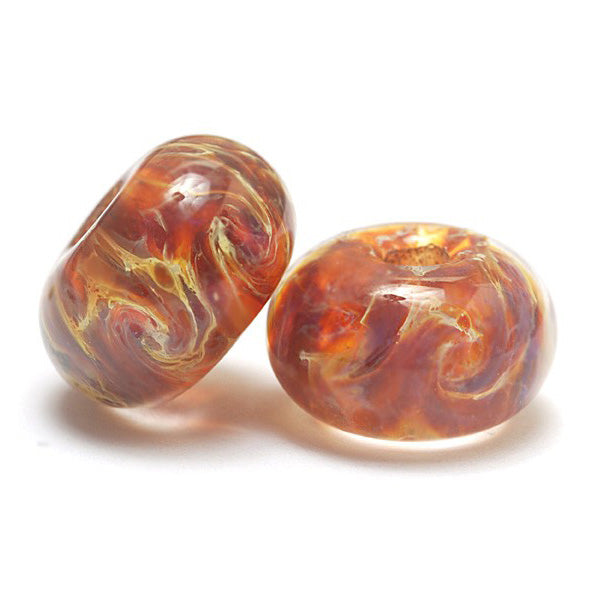 Handmade Borosilicate Rondelle beads with a free-style yellow and purple design.