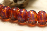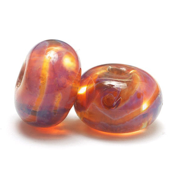 Handmade Borosilicate Rondelle beads with a free-style orange and purple design.