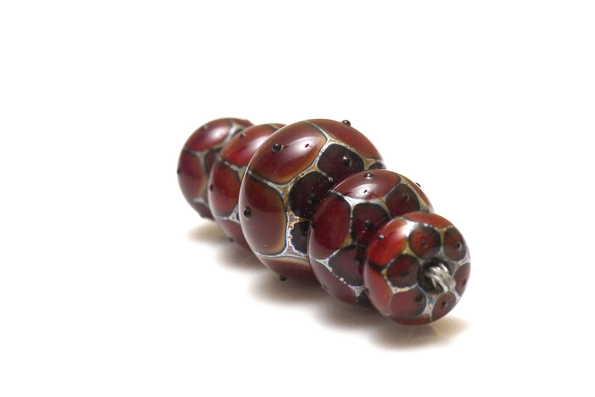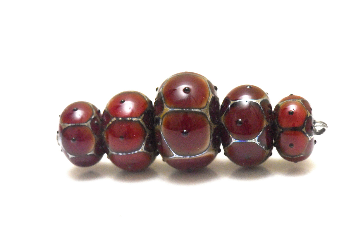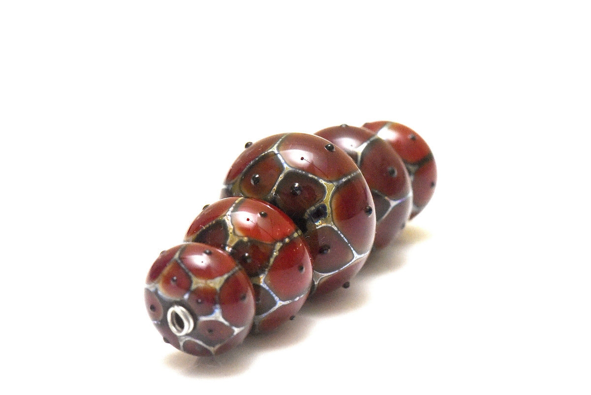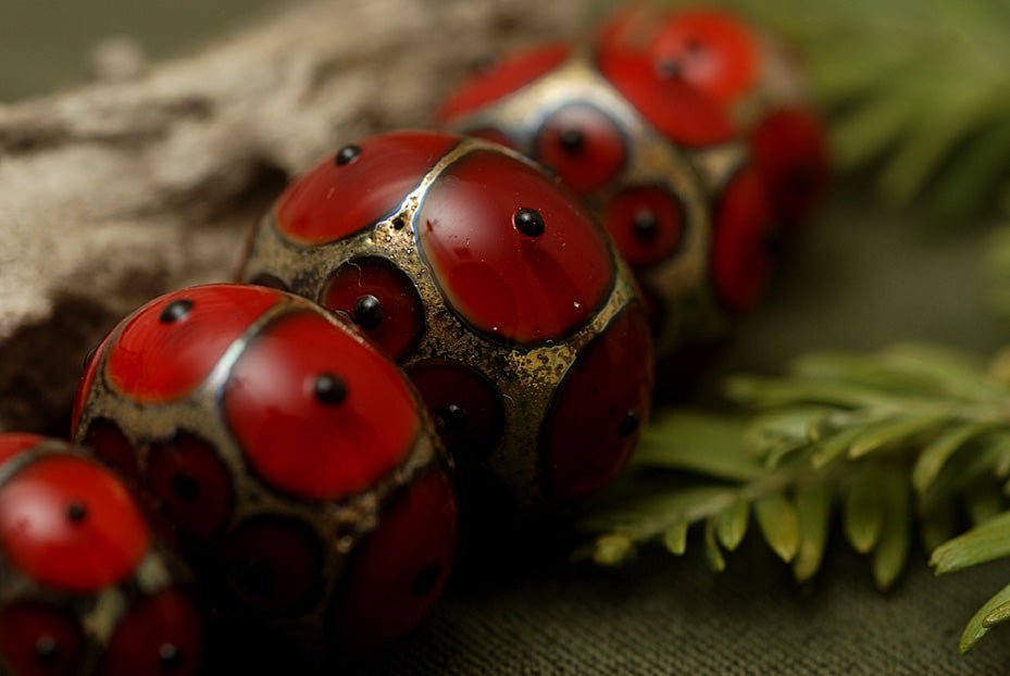 Add texture and charm to your jewelry creations with these handmade Red Rondelle Beads featuring raised black metal dots. Featured in Bead Style magazine.