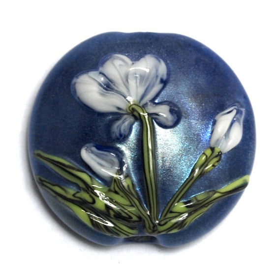 little white flower on a wedgewood blue pearlized glassbead, lightly dusted with pixie dust to give it added sparkle.
