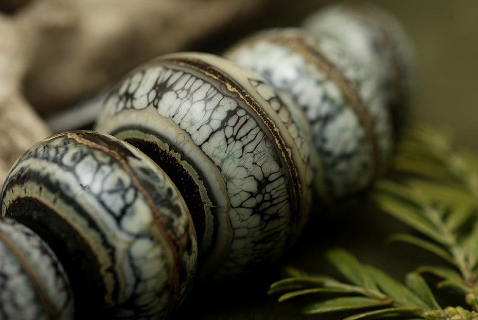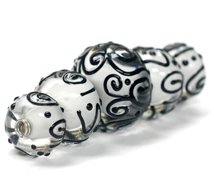 Handmade Sable Celestial Rondelle Beads featuring a freestyle design of waves and moon on a black base with shimmering silver dichroic accents. The same intricate design appears all around, making these beads perfect for necklaces, bracelets, or artisan jewelry projects.