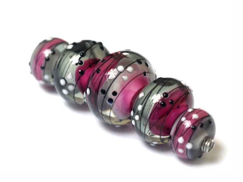Little hot pink and gray shiny beads with white and black dots. Same design all around.