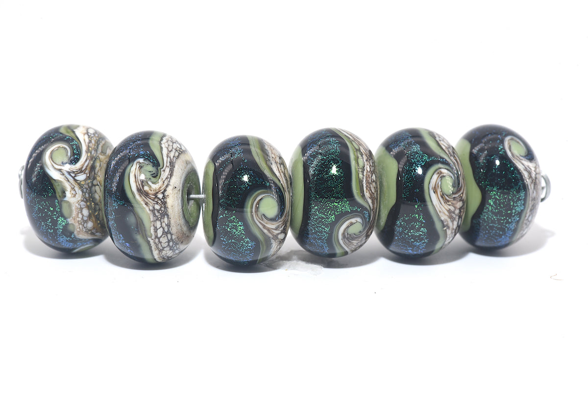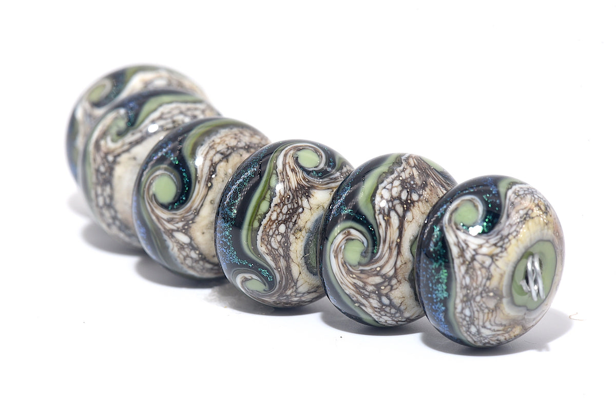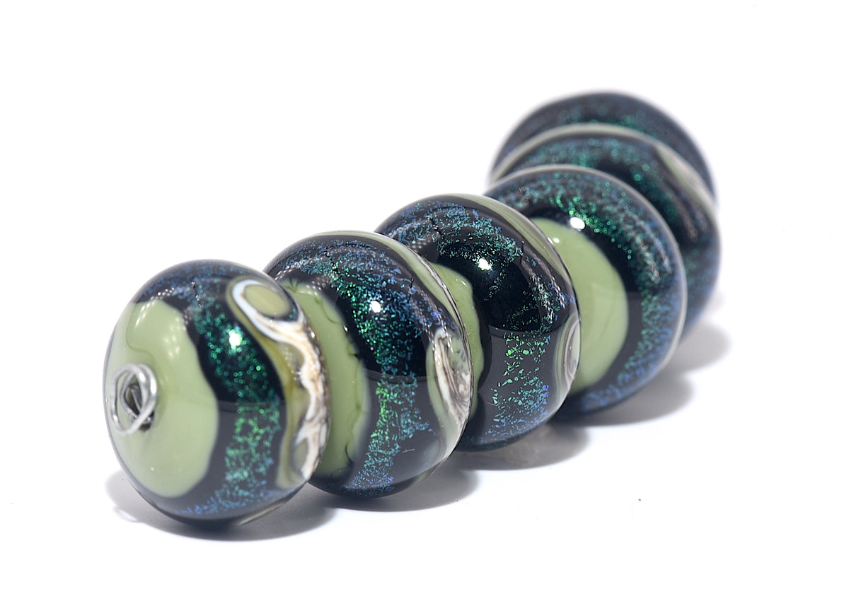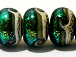 These rondelle beads feature a freestyle design on an olive green base, enhanced with green and yellow dichroic accents. The design is consistent all around.