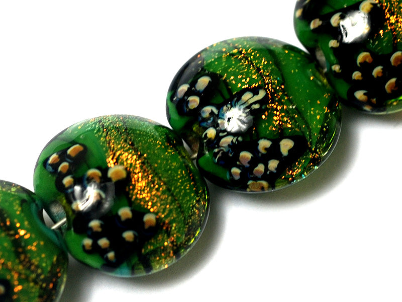 Green beads with orange gold dichroic in a
