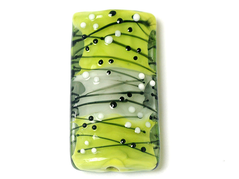 Little black and white dots on green and gray shiny glass bead. Same design on both sides.