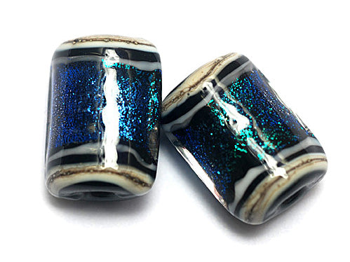 These Arctic Blue Shimmer Mini Kalera beads feature a sparkling mix of light and darker blue dichroic in a freestyle design. The Kalera is a pressed cylinder shape, ideal for creating earrings or other jewelry pieces. Same design on both sides.