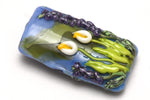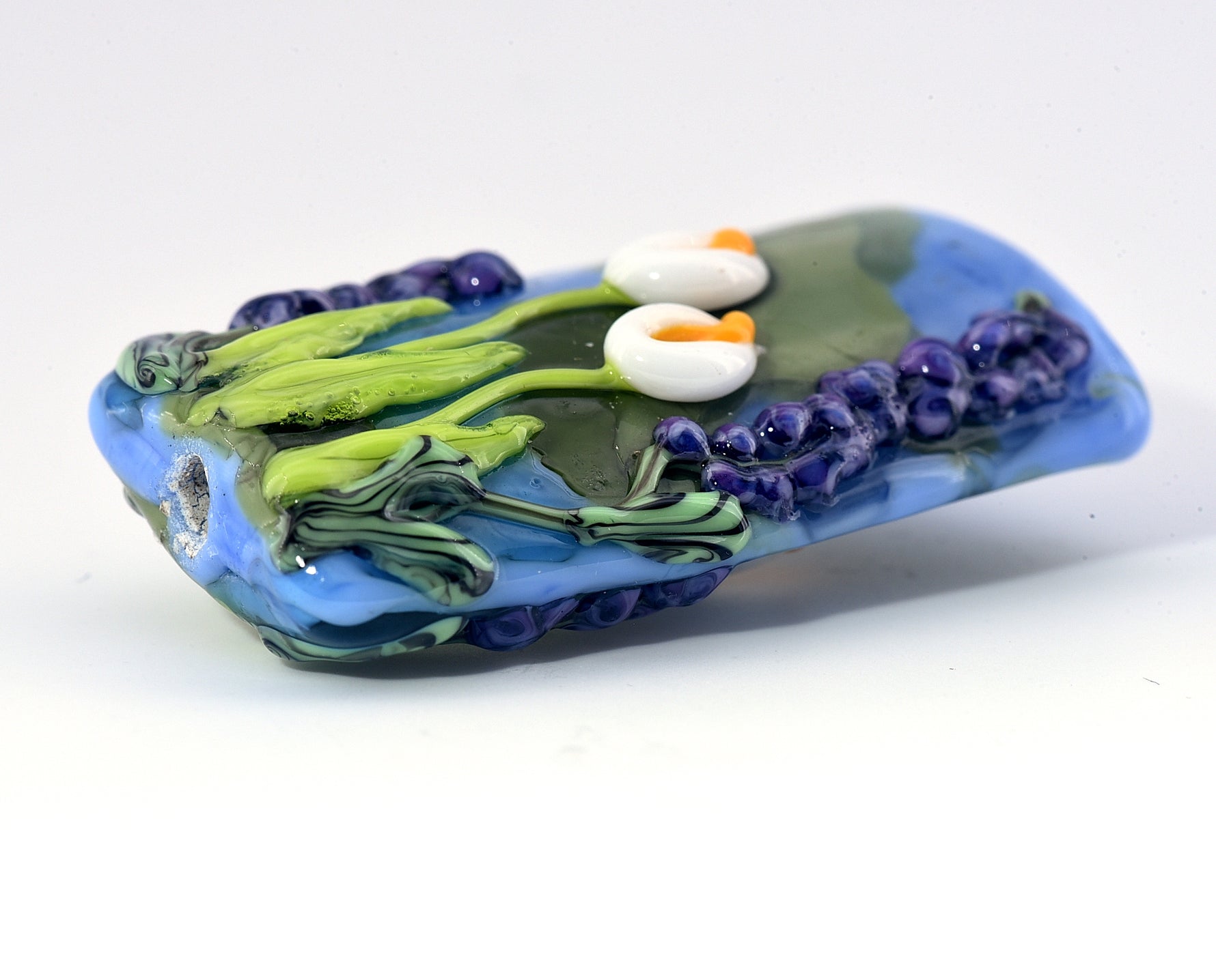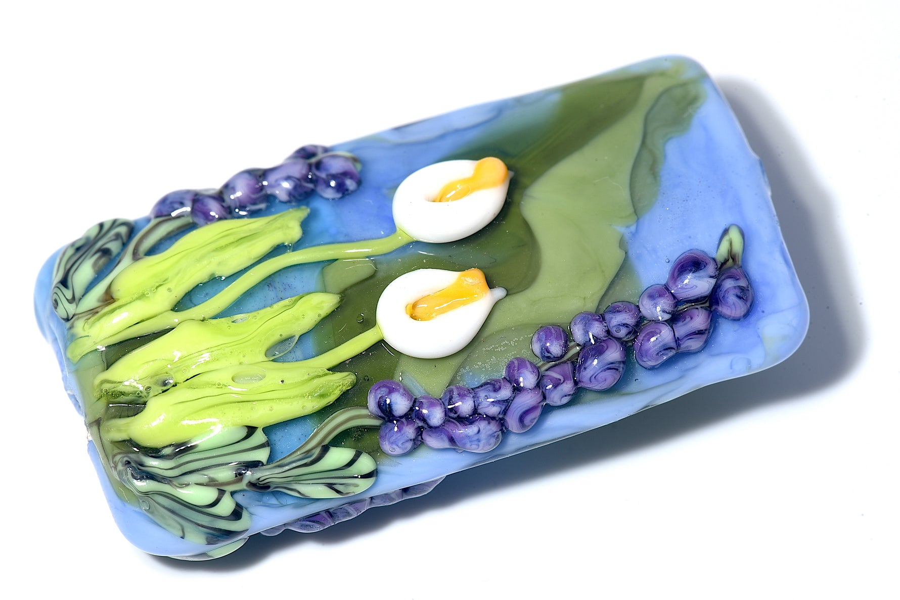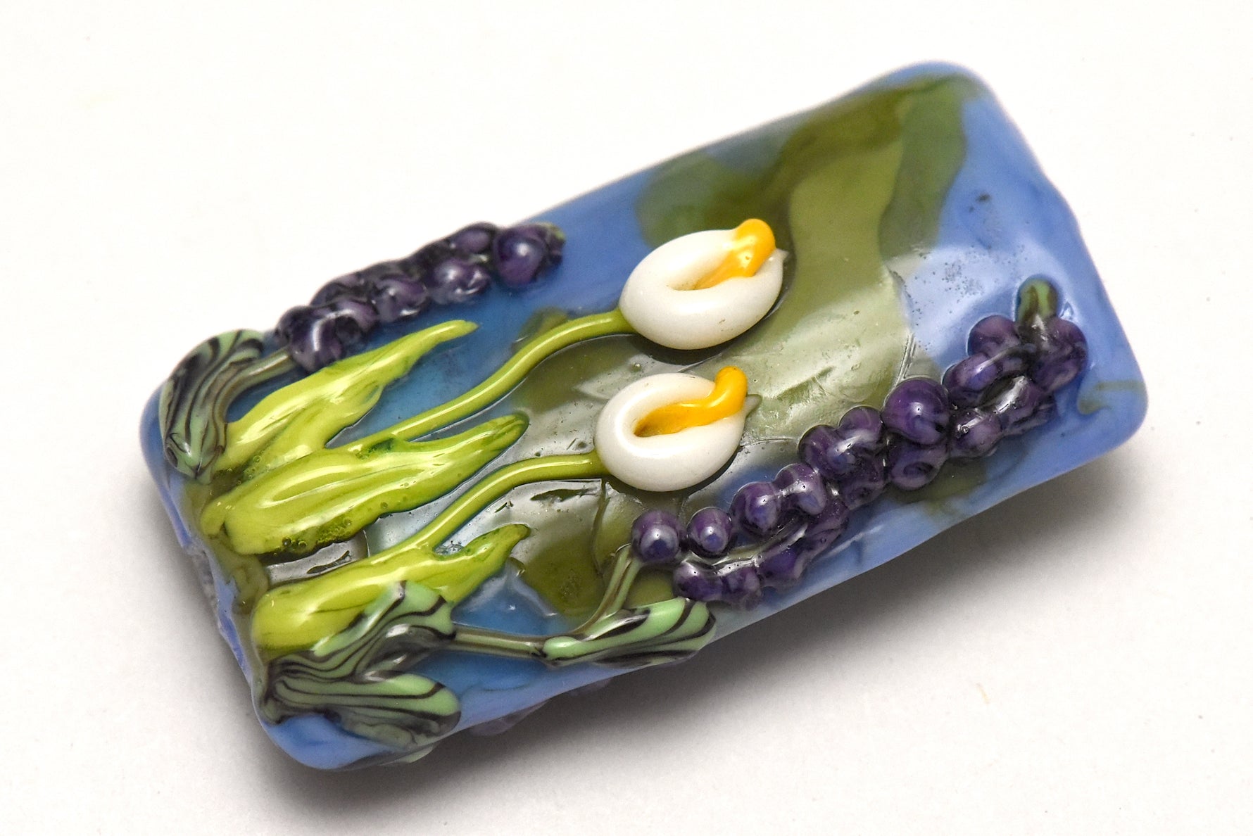 Featuring two elegant calla lilies accented with delicate purple flowers against a scenic backdrop. The bead is beautifully detailed on both sides, with a gently curved (not flat) surface for added dimension.