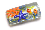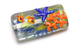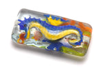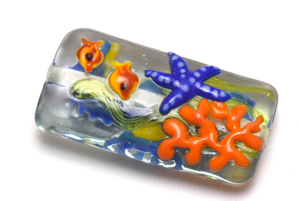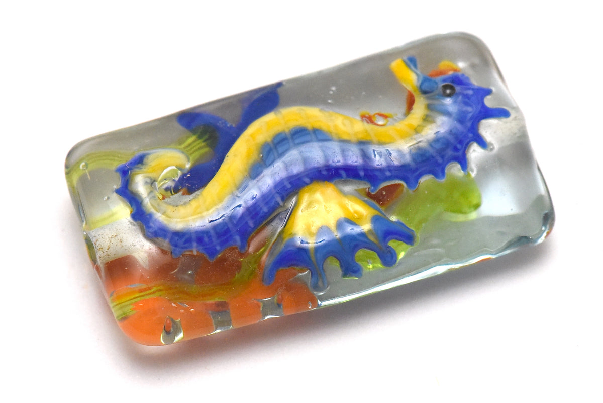 This lentil-shaped focal bead features a detailed seahorse design on the front. The back of the bead is flat with the same base color for a clean finish.