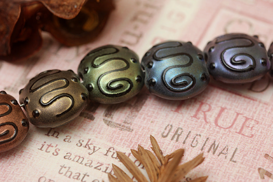 Rondelle beads with a luminous pearl-surface finish in different colors. The design is the same on both sides.
