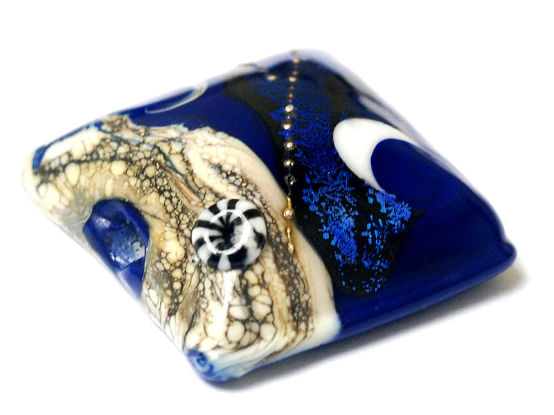 Enhance your jewelry designs with this handmade Cobalt Celestial Pillow Bead. Featuring a freestyle design of waves and moon on a cobalt blue base with blue dichroic, the design appears on both sides. The slightly puffed, pillow-shaped front adds depth and dimension, while the flat back ensures easy stringing.