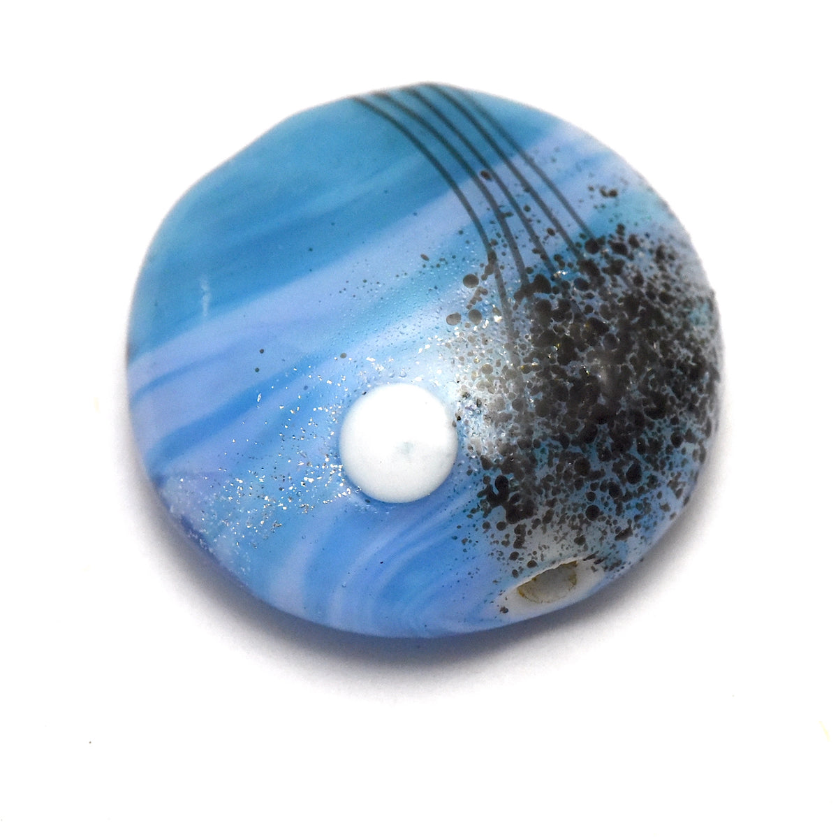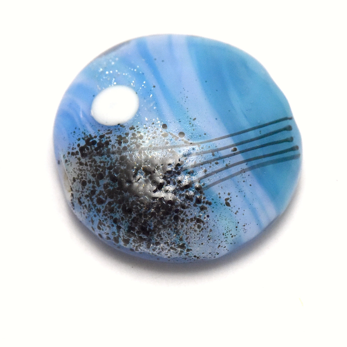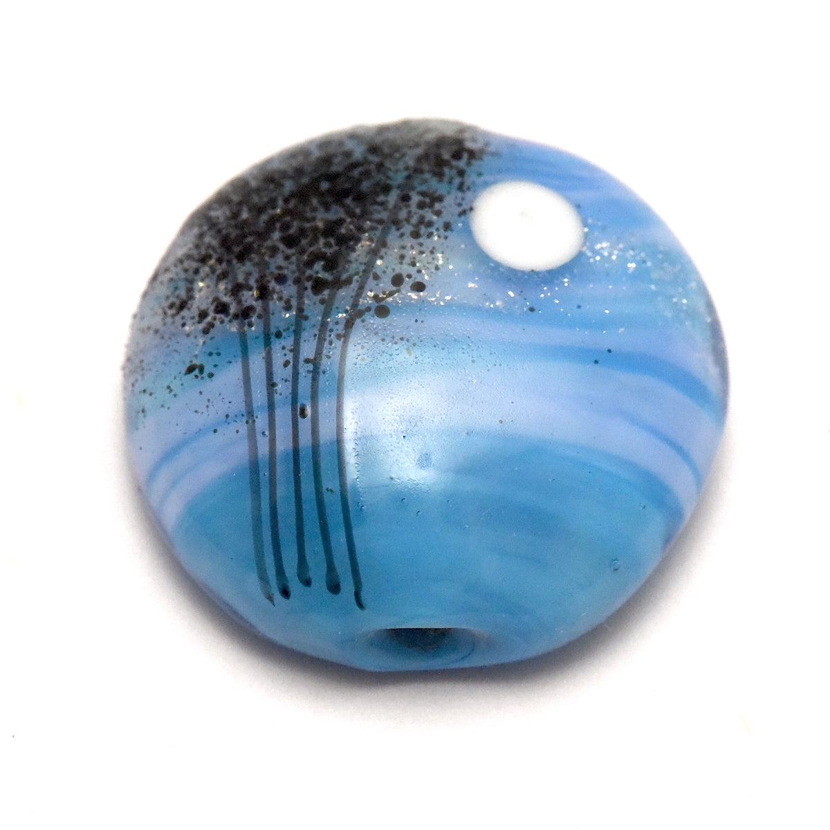 This handcrafted lampwork bead reflects the tranquil beauty of a moonlit night. The base shimmers in light blue with soft lavender streaks, like drifting clouds across the sky. A white moon glows gently, while black stringer details form tree silhouettes. Dichroic silver sparkle catches the light like twinkling stars, adding depth and magic to the scene. The flat-backed lentil shape makes it a versatile focal bead, perfect for pendants or centerpiece designs.