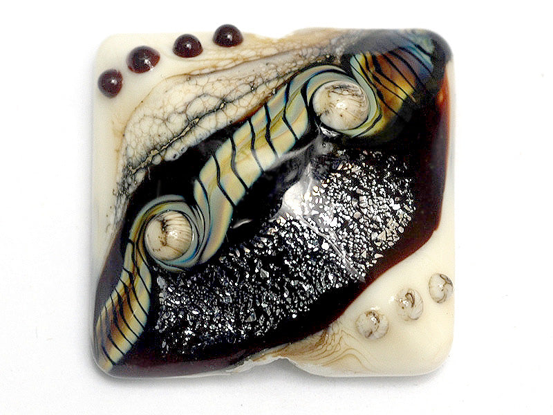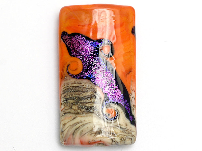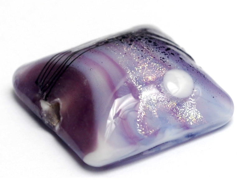 This handcrafted lampwork bead reflects the tranquil beauty of a moonlit night. The base shimmers in light violet with soft lavender streaks, like drifting clouds across the sky. A white moon glows gently, while black stringer details form tree silhouettes. Dichroic silver sparkle catches the light like twinkling stars, adding depth and magic to the scene. The flat-backed pillow shape makes it a versatile focal bead, perfect for pendants or centerpiece designs.