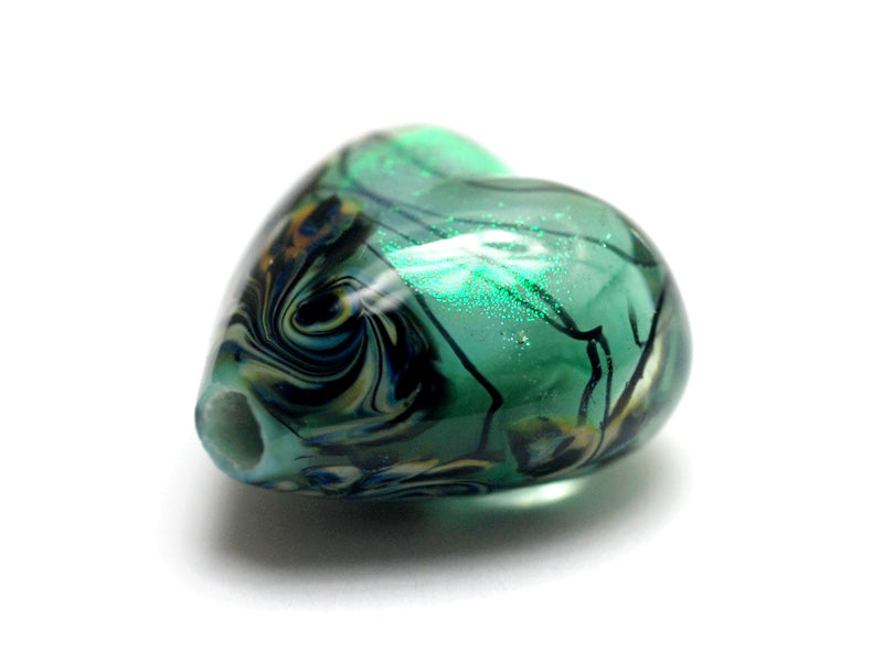 A handmade seafoam green glass heart bead accented with shimmering green dichroic. Slightly puffed on the front with a flat back, featuring the design on both sides for a balanced finish.