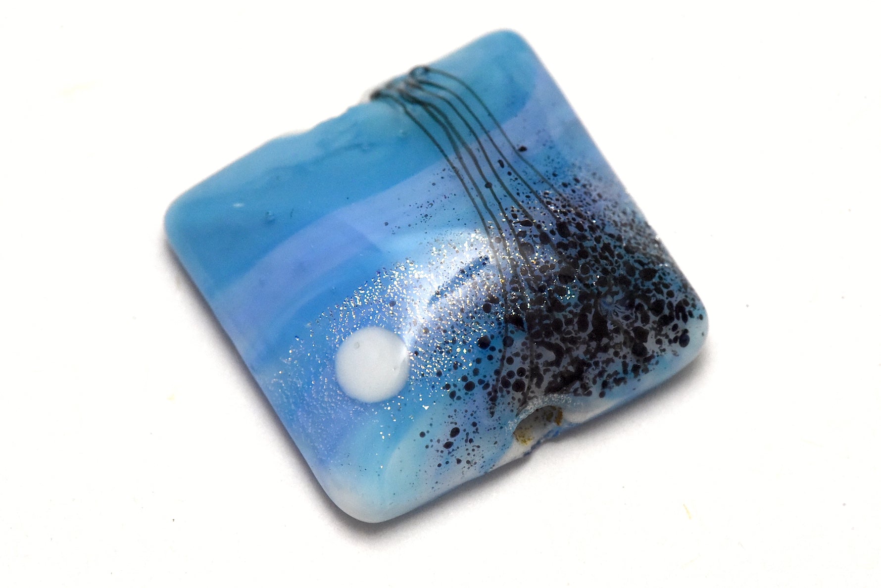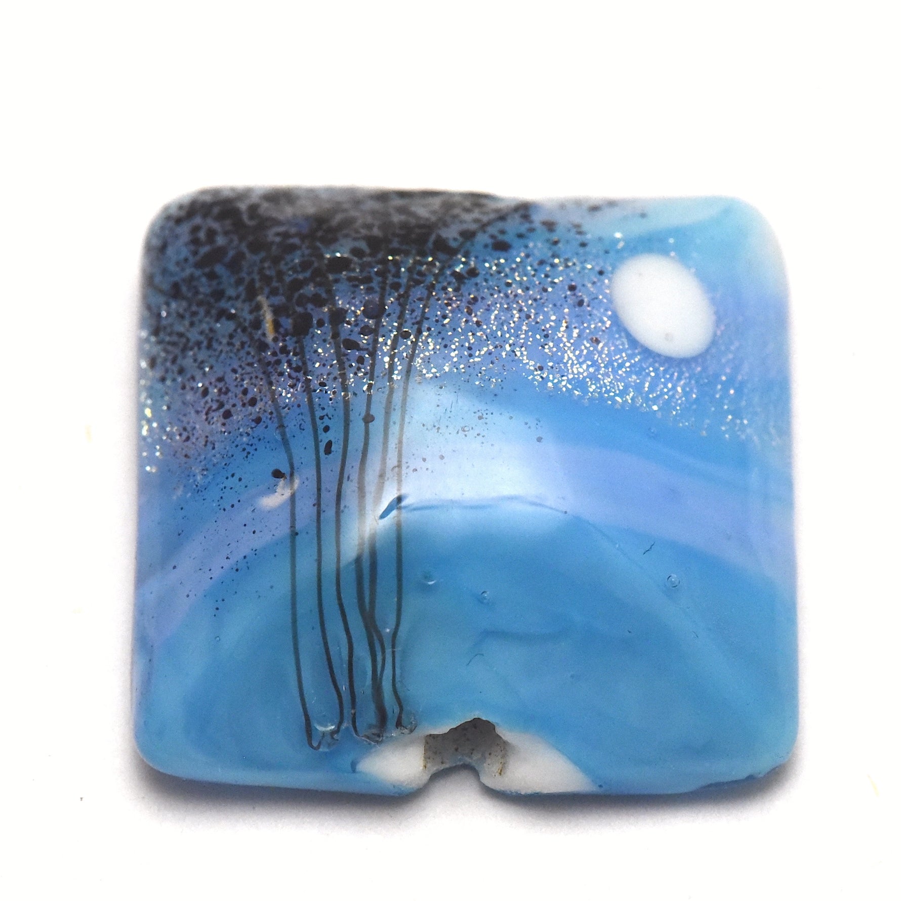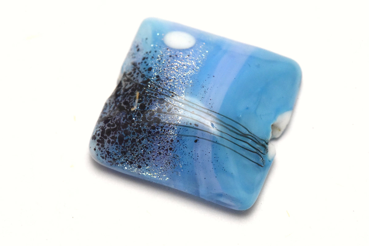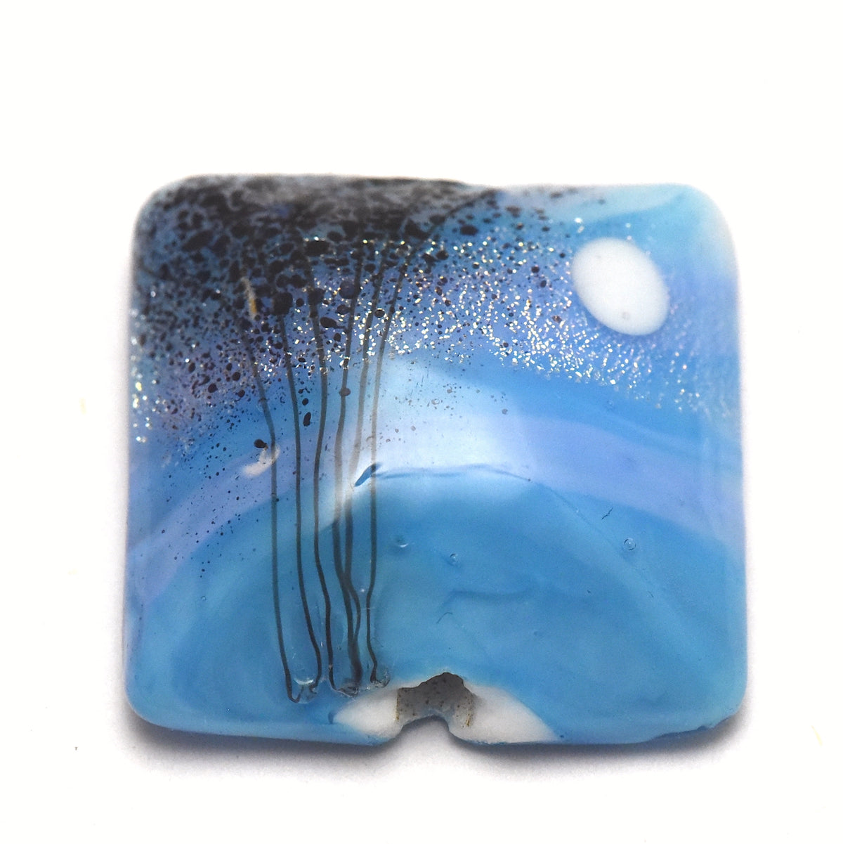 This handcrafted lampwork bead reflects the tranquil beauty of a moonlit night. The base shimmers in light blue with soft lavender streaks, like drifting clouds across the sky. A white moon glows gently, while black stringer details form tree silhouettes. Dichroic silver sparkle catches the light like twinkling stars, adding depth and magic to the scene. The flat-backed pillow shape makes it a versatile focal bead, perfect for pendants or centerpiece designs.