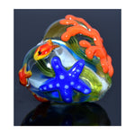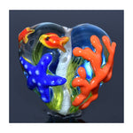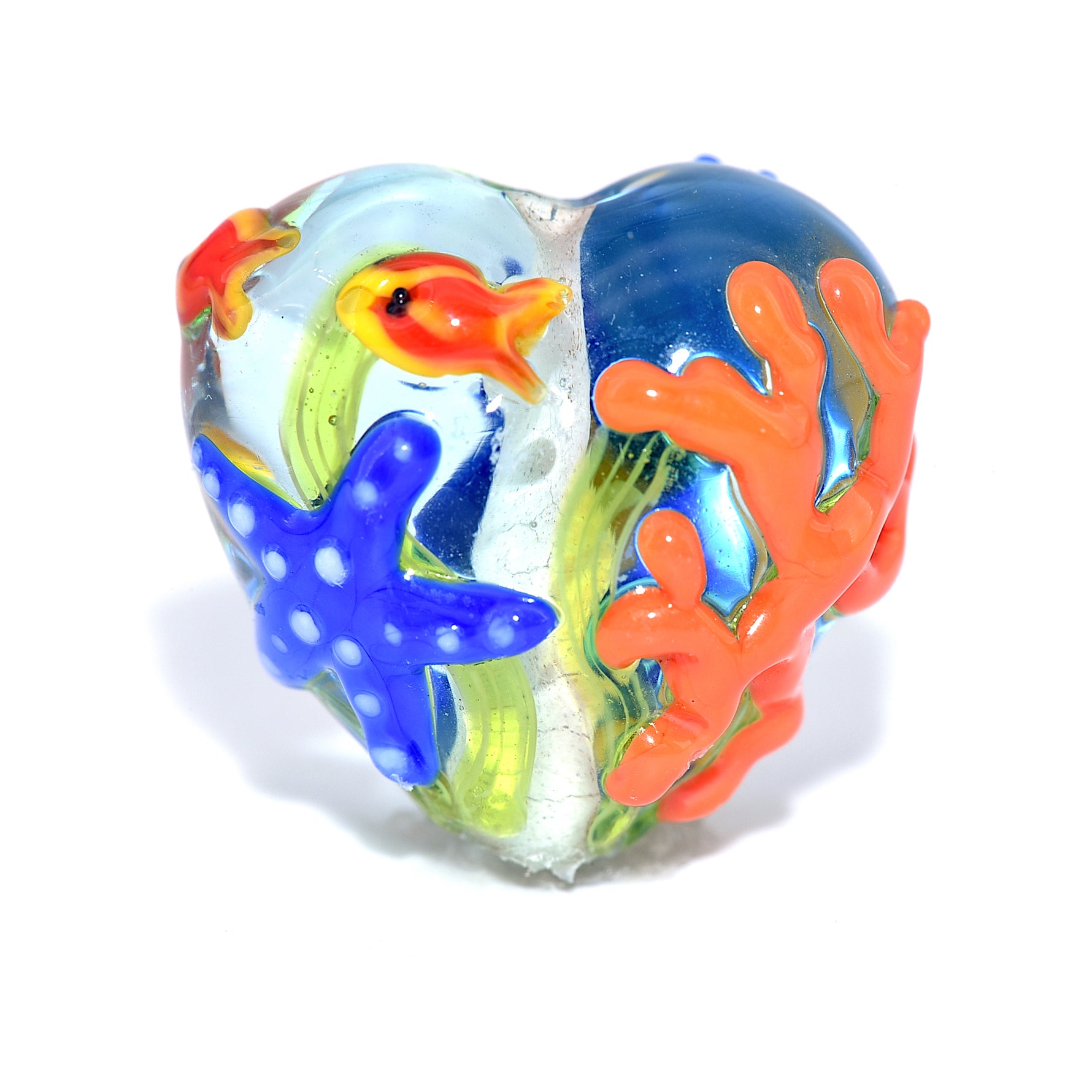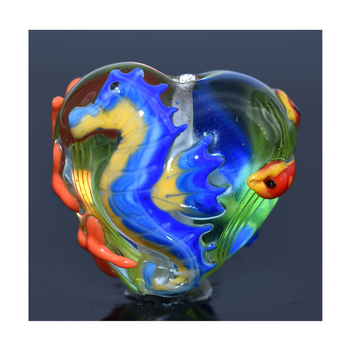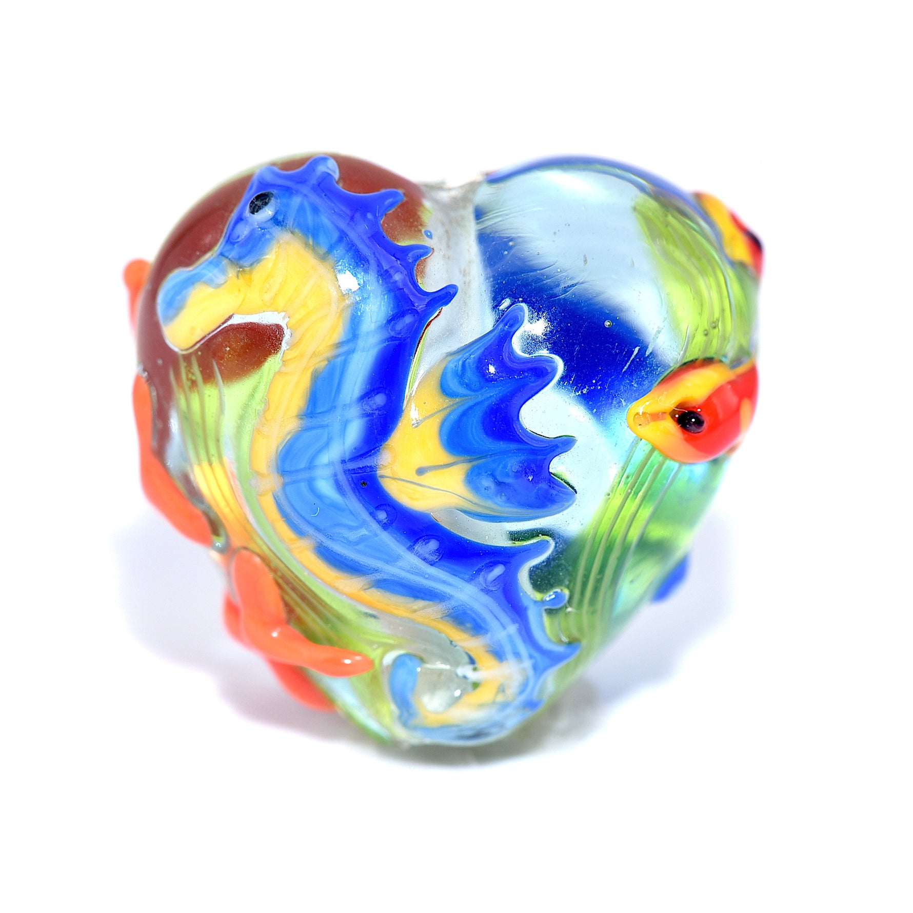 This plump heart bead features a detailed seahorse on the front, while the reverse side displays coral, a starfish, and two red fish — creating a miniature ocean scene in glass.