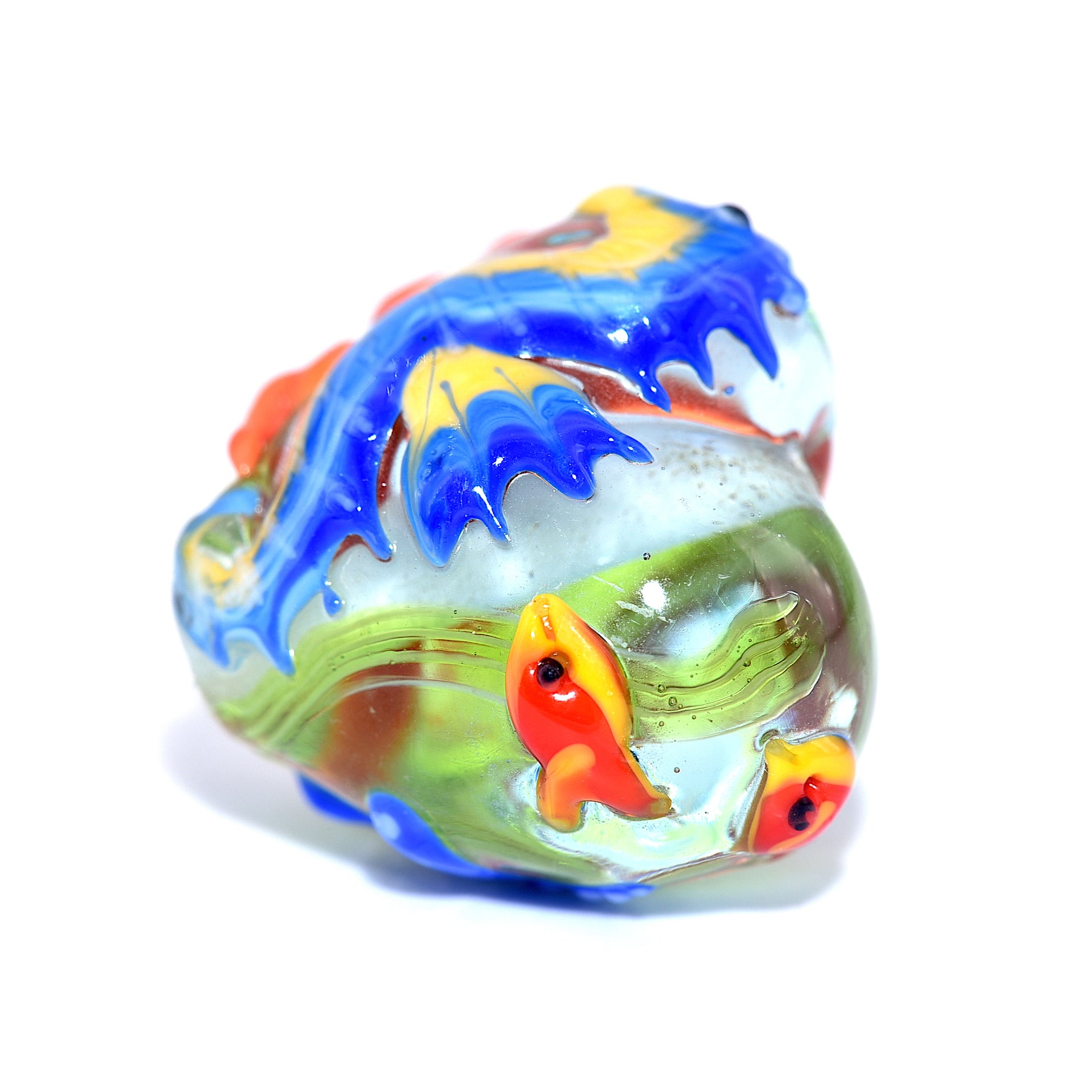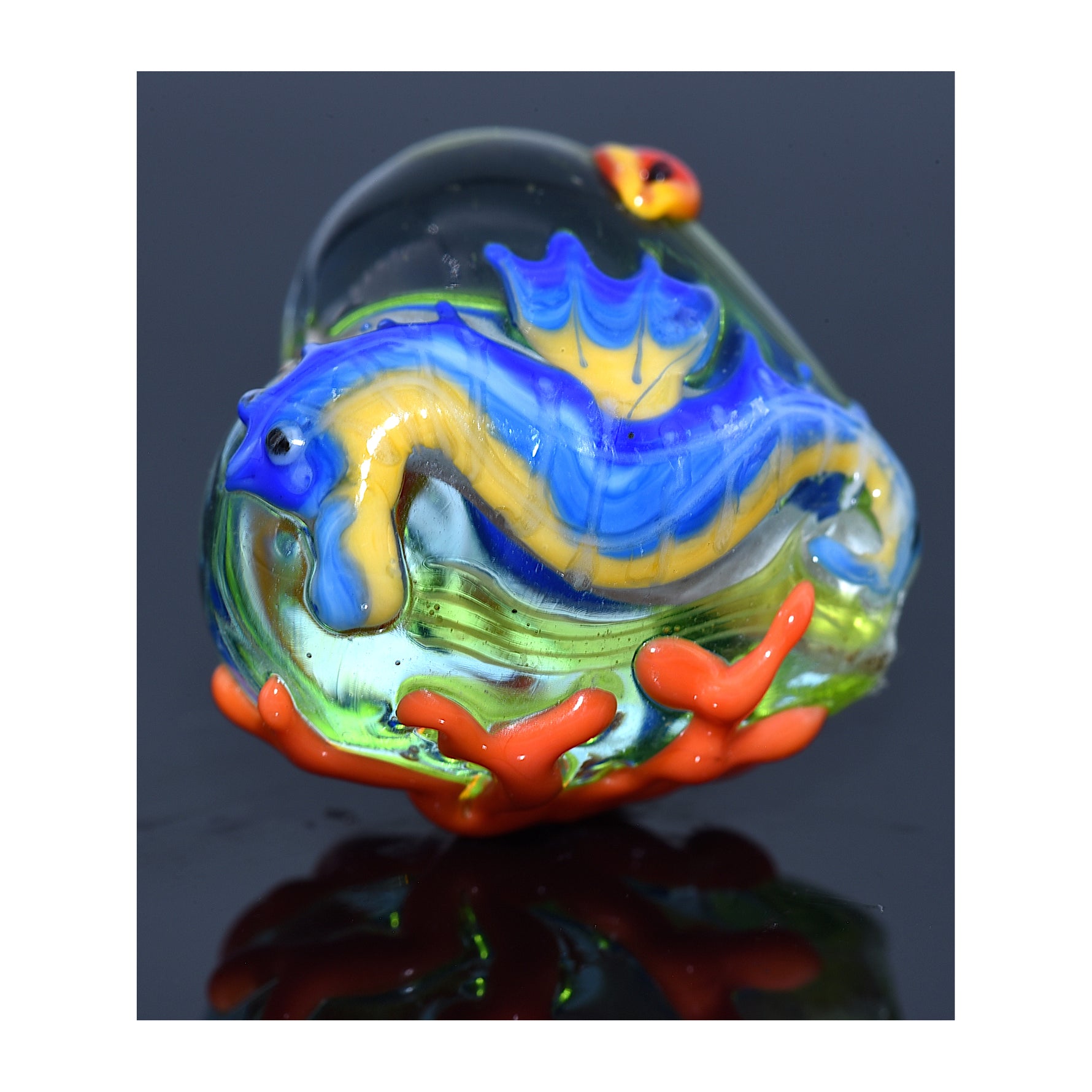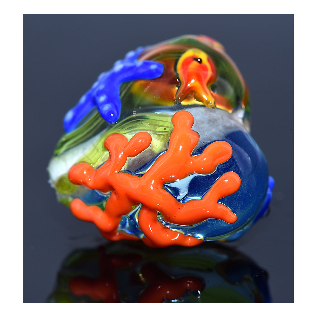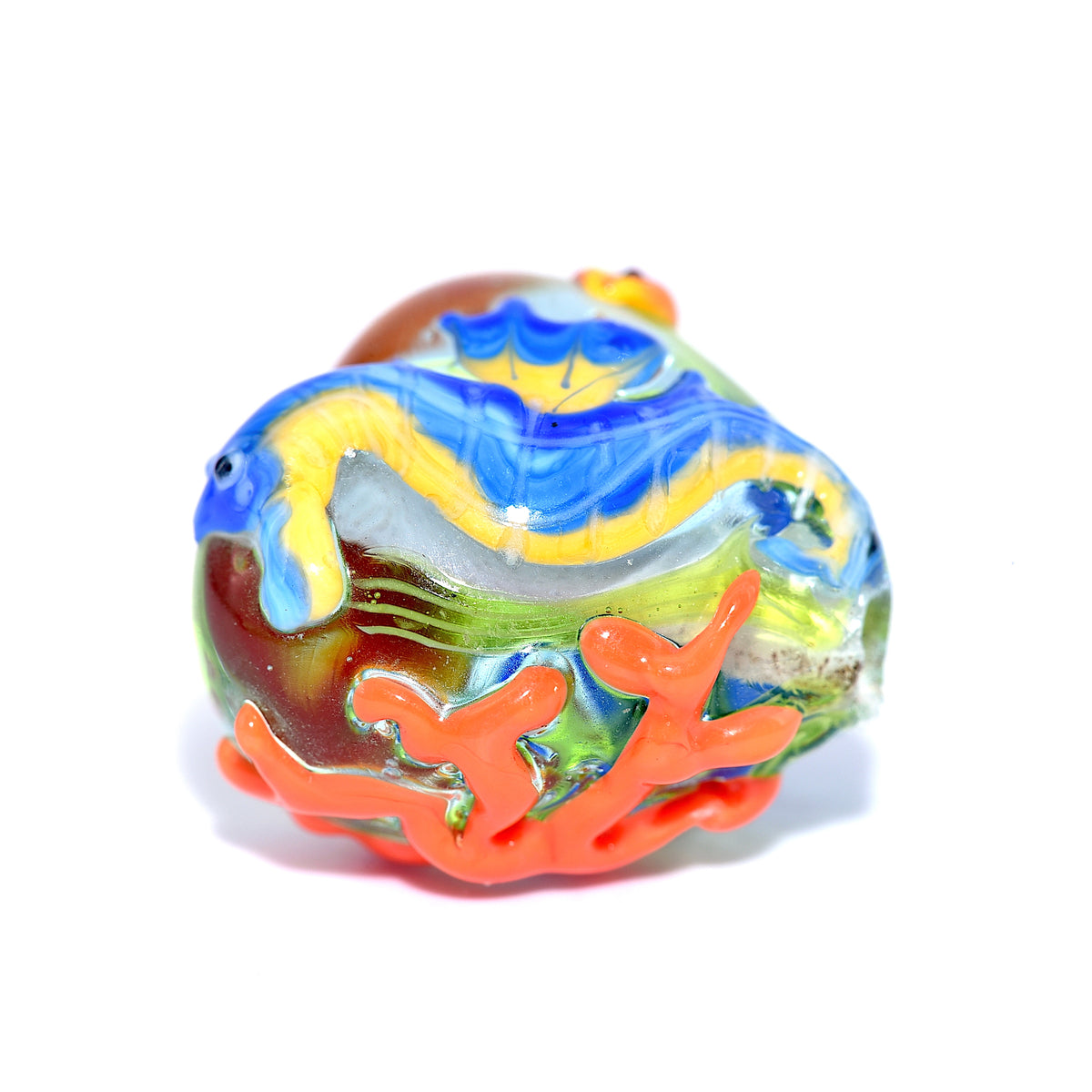 This plump heart bead features a detailed seahorse on the front, while the reverse side displays coral, a starfish, and two red fish — creating a miniature ocean scene in glass.