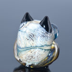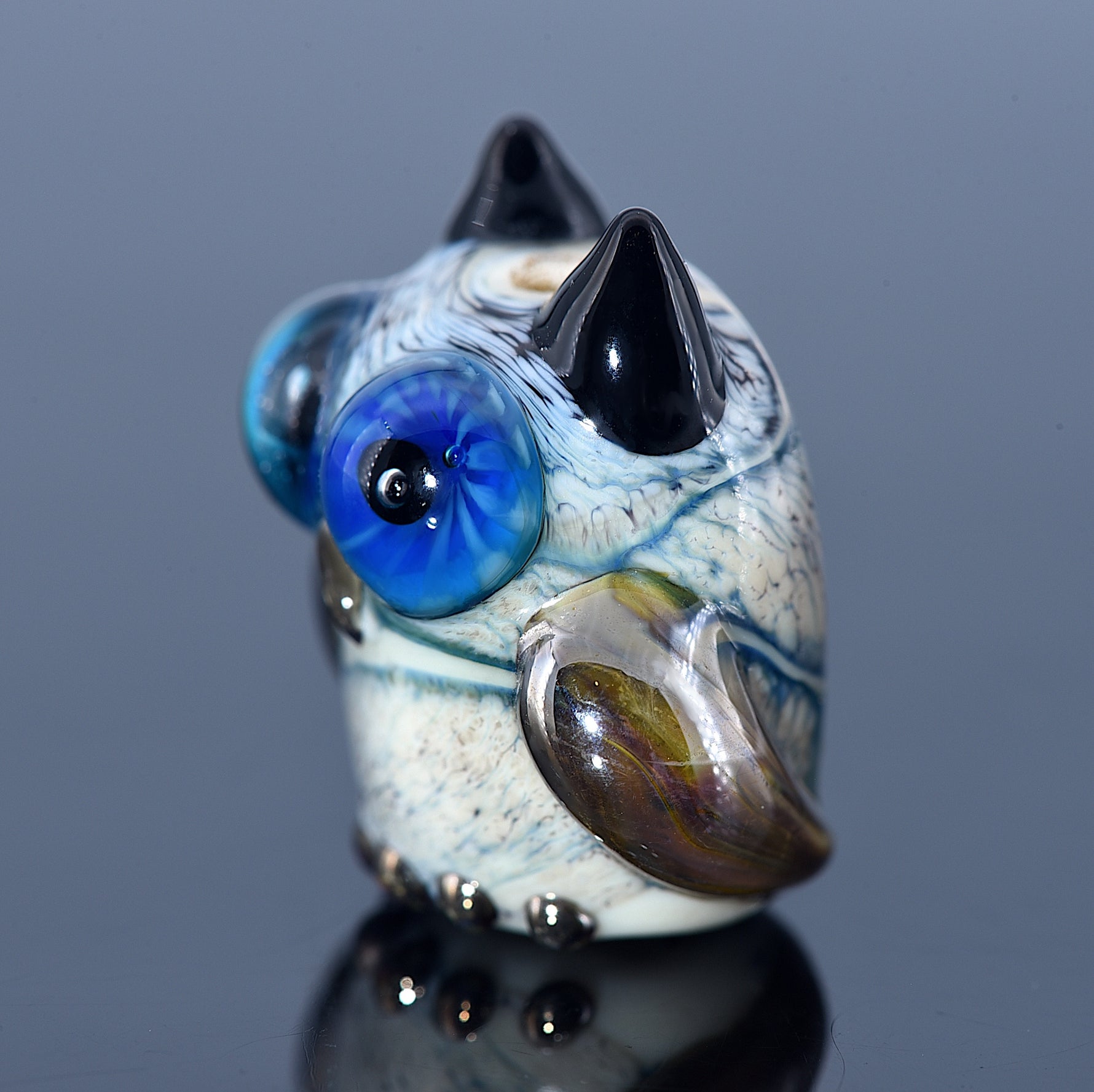 These owls are made of Murano and Raku glass. They are wrapped with sterling silver foil to give a more interesting shimmer result. The eyes are the focal point, made of special custom made glass cane to give the fine detail. Same coloring/design all around.