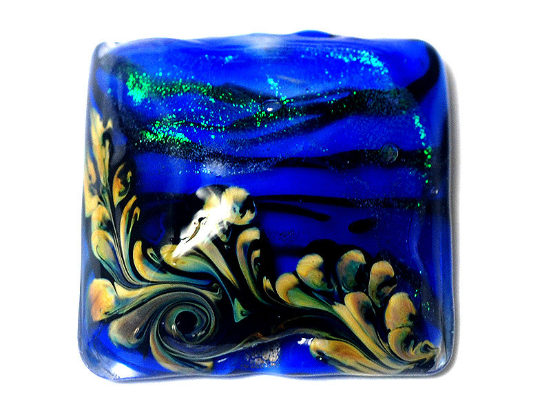 This pillow-shaped focal bead features a vibrant blue base with sparkling green dichroic accents, creating a stunning Sapphire Sea shimmer effect. Perfect as a centerpiece for necklaces, bracelets, or other jewelry designs.