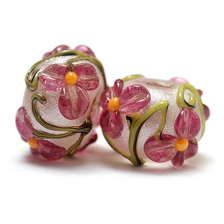 Delicate fuchsia pink flowers adorn each pearlized glass bead, lightly dusted with pixie dust for a subtle sparkle. The design is consistent on all sides, making these beads perfect for standout jewelry pieces.