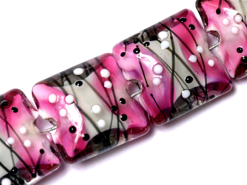 Little black and white dots on hot pink and gray shiny glass bead. Same design on both sides.