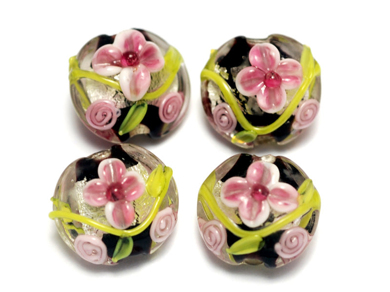 10106512 - Four Pink/Black/Green Silver Foil Lentil Beads