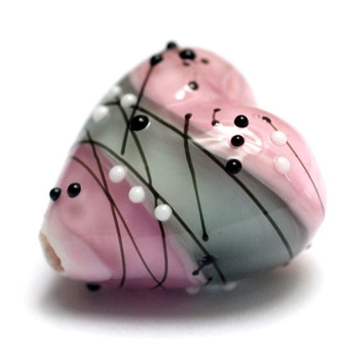 Little black and white dots on pink and gray shiny glass bead. Same design all around.