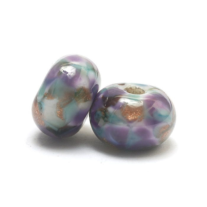 These handmade Wisteria Skies Rondelle Beads feature soft purple tones with an artisan touch, perfect for elegant and creative jewelry designs.