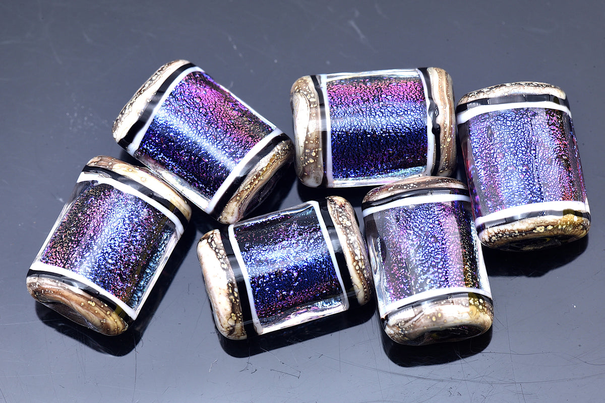 These Amethyst Jewel Ridge Mini Kalera Beads feature shimmering dichroic accents and a ridge texture on both sides. The Kalera is a pressed cylinder shape, making it especially popular for earrings. Each strand has enough beads to create three pairs.