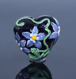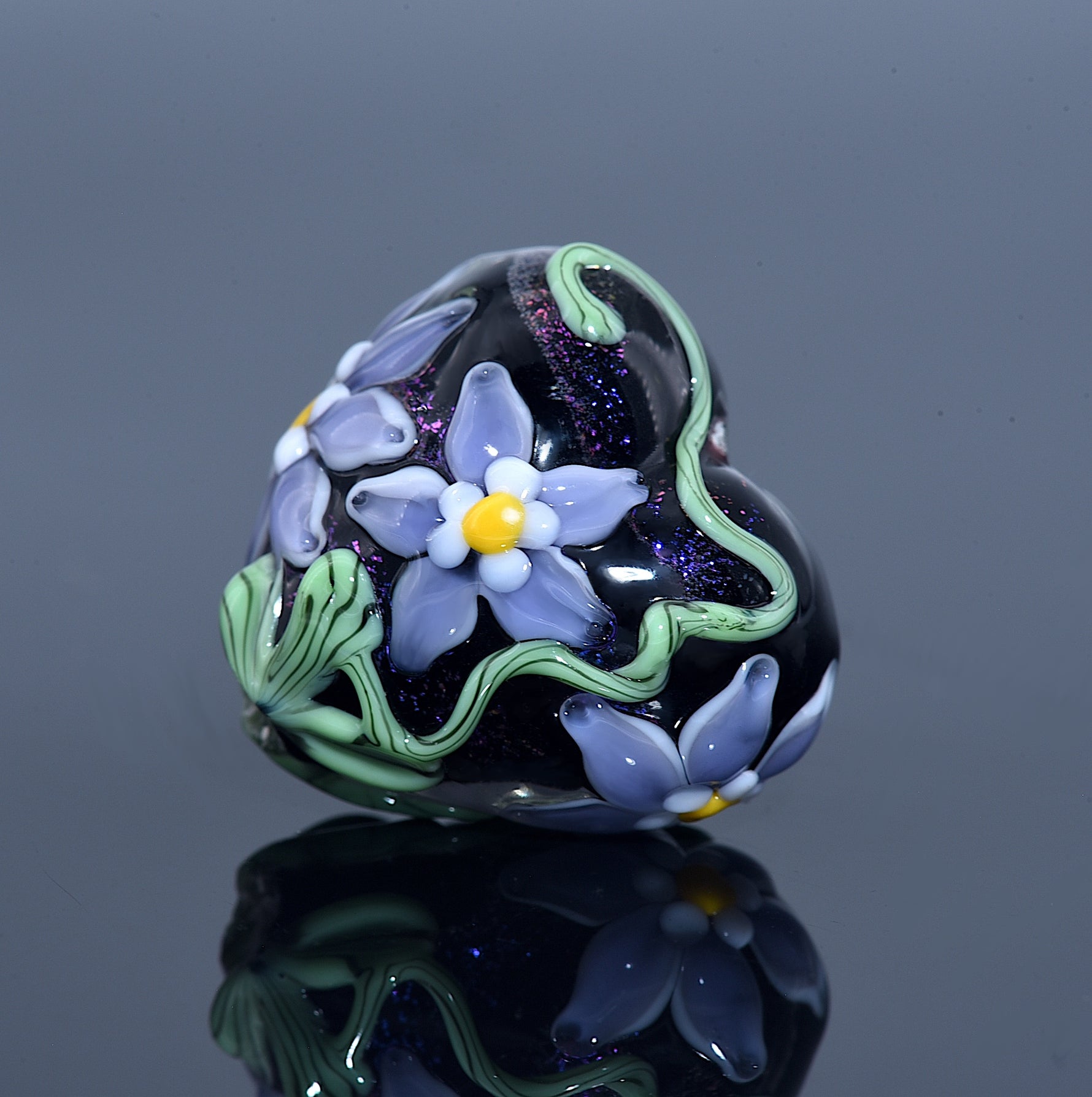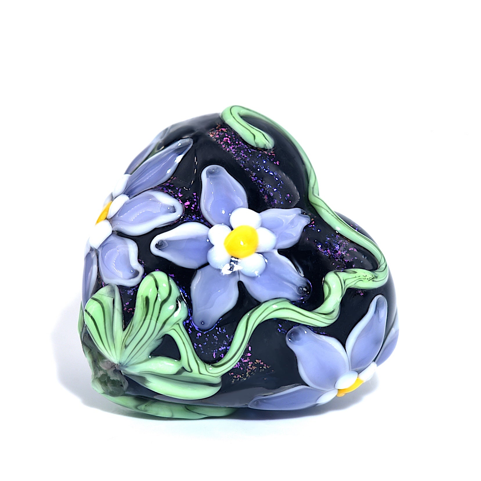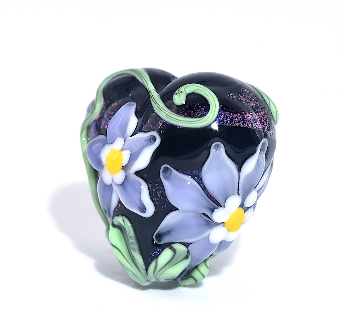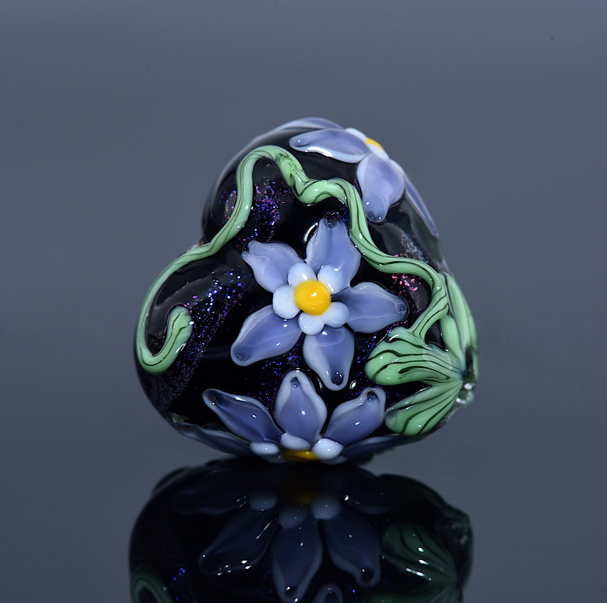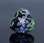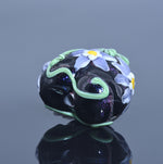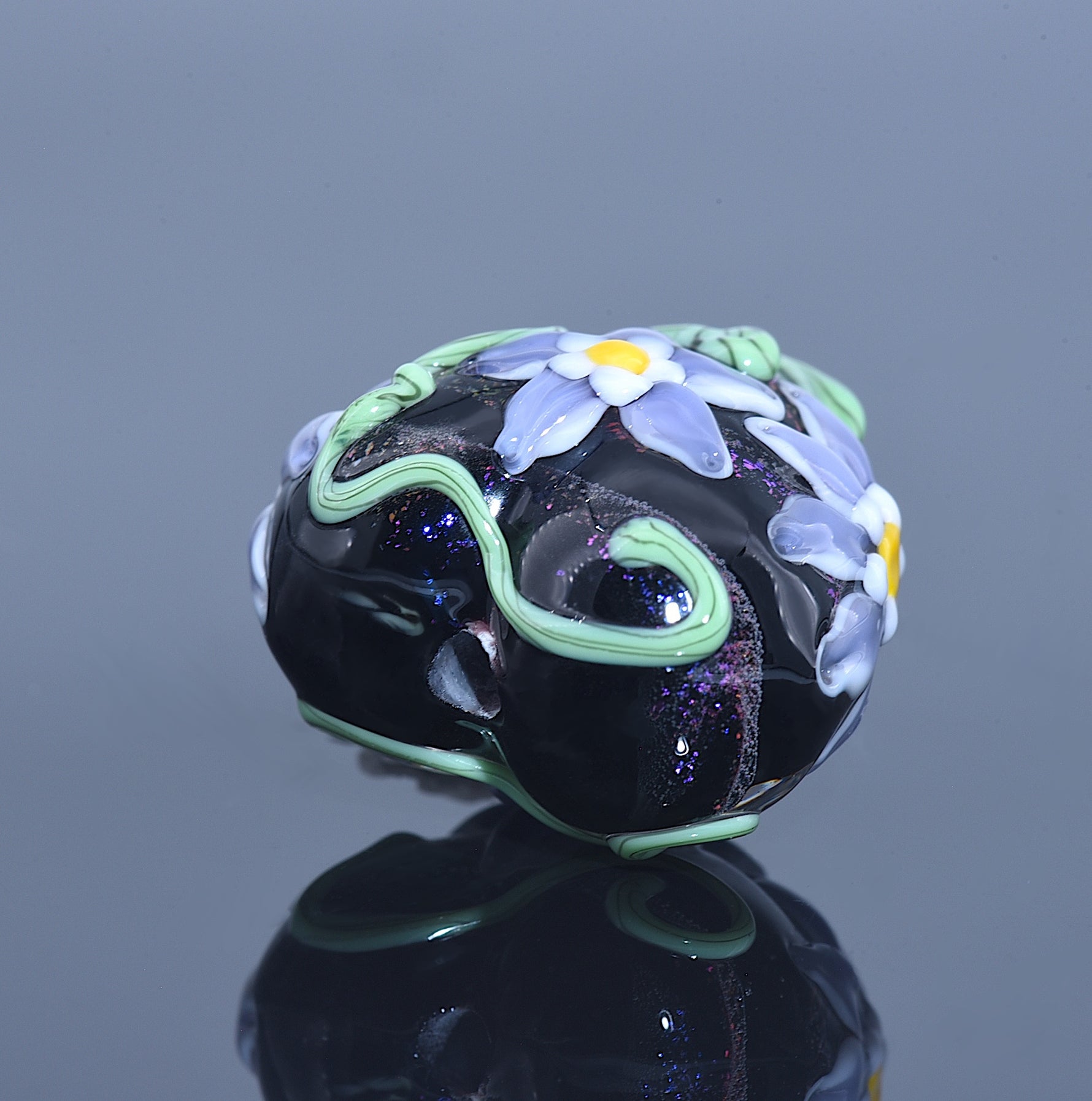 This bead showcases purple floral patterns on a black glass base, enhanced with purple dichroic elements, creating pure elegance for your projects.
