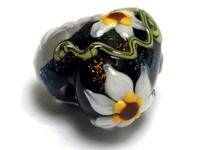 This bead showcases purple floral patterns on a black glass base, enhanced with purple dichroic elements, creating pure elegance for your projects.