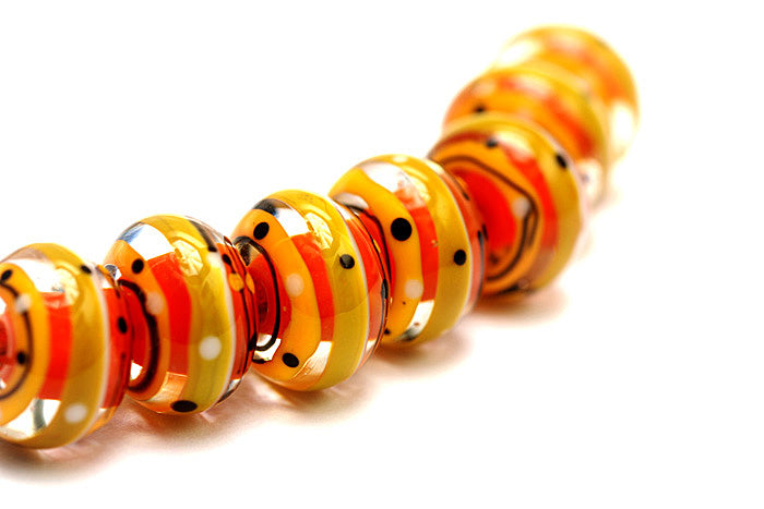 These vibrant butterscotch rondelle beads feature a raised metal dots design, adding texture and character to your jewelry creations. Each bead is individually handcrafted, making every piece unique.